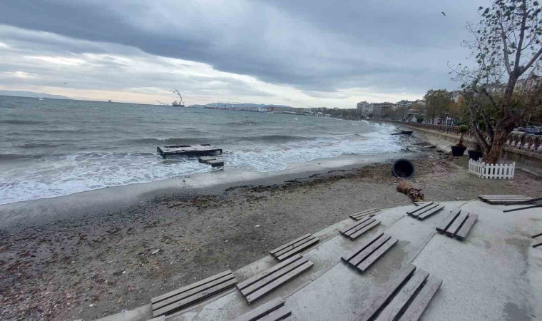 Fırtına sebebiyle dev dalgalar kıyıları dövmeye devam ediyor. Fırtınayla birlikte deniz adeta çalkalanırken, limanda rıhtıma bağlanan teknelerde dans etti.