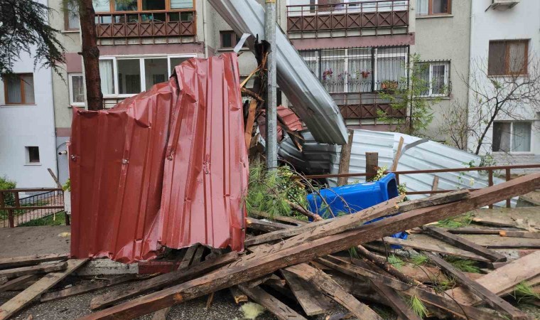Karabük’te etkili olan şiddetli rüzgar ve fırtına apartmanların çatılarını uçururken, elektrik direklerini de yıktı.