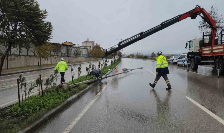 Saatte 35 kilometre hızı bulan fırtına Karabük - Safranbolu kara yolu Sanayi Kavşağı mevkiinde yer alan aydınlatma direğini yerinden sökerek devirdi.