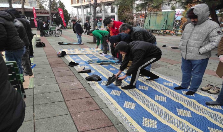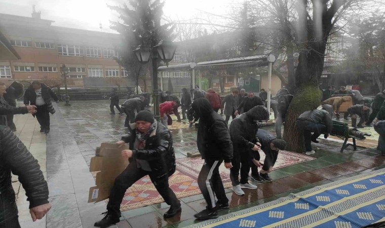 Eskişehir’de bugün saatlerinde kısa süreli etkili olan yağmur, Cuma namazını camide yer bulamadıkları için dışarıda kılmak zorunda kalan vatandaşları hazırlıksız yakaladı. Cuma namazı esnasında yağmur altında kalan camii cemaati, baştan aşağı ıslanmak pahasına namazlarını kıldılar ve bu esnada saflarını terk etmediler.