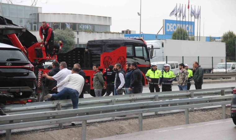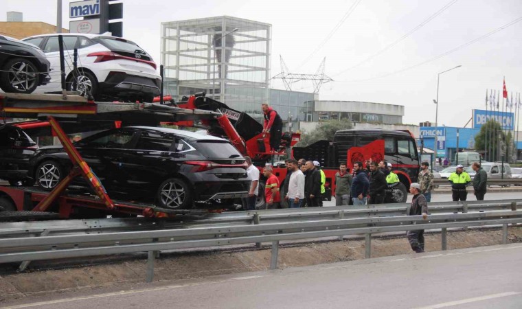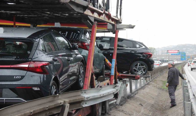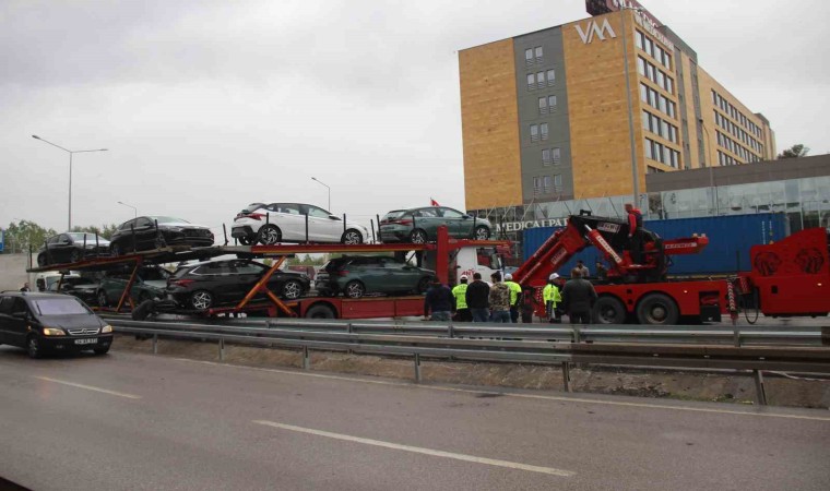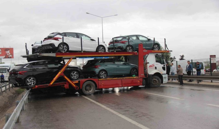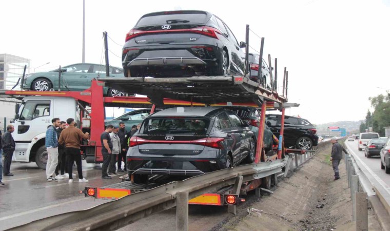 Kocaeli’nin İzmit ilçesinde yağış sonrasında kayganlaşan yolda sürücüsünün direksiyon hakimiyetini kaybettiği 8 sıfır araç yüklü tır, bariyerlere çarparak makaslama yaptı. Kazanın ardından D-100 kara yolu bir saat boyunca trafiğe kapandı.