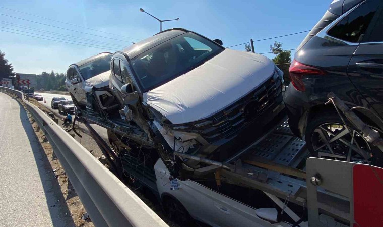 Kocaeli’nin İzmit ilçesinde meydana gelen kazada, sıfır araç taşıyan tır yol kenarındaki kanala düşerek yan yattı. Tırın arkasında bulunan Hyundai marka sıfır otomobiller, bariyerlere sürterek hasar gördü.