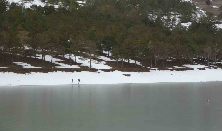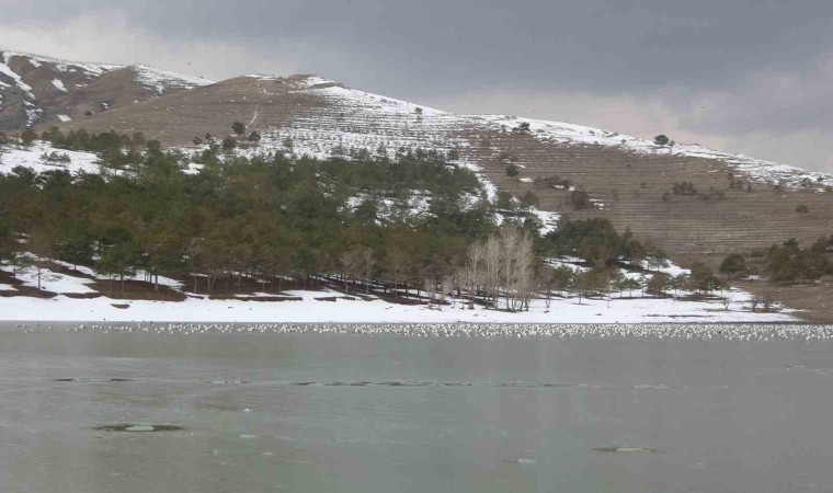 Van’ın merkez İpekyolu ilçesi sınırında yer alan Sıhke Gölü’nün yüzeyi, dondurucu soğuklardan dolayı buzla kaplandı.