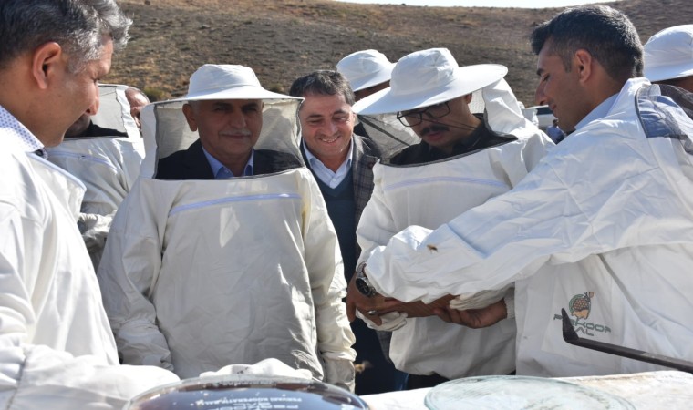 Vali Kızılkaya ve beraberindekiler, daha sonra arıcı tulumu giyerek yılın sezonun ilk kara kovan balını kesti.