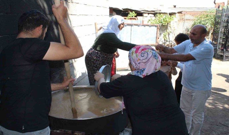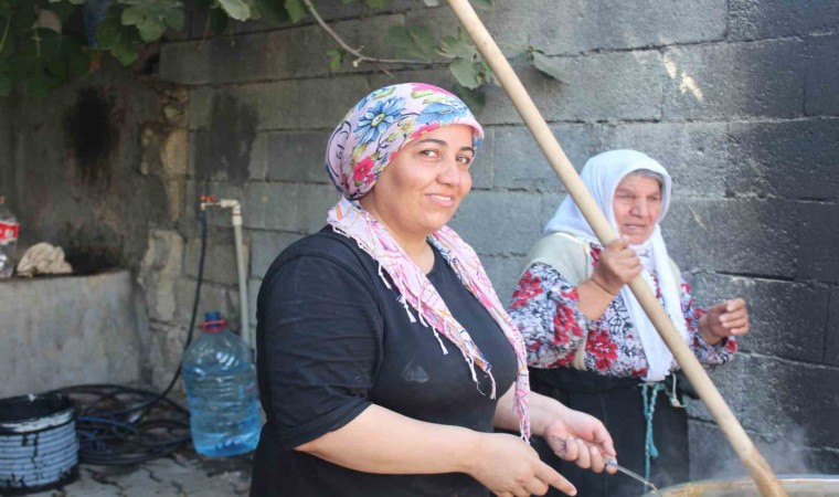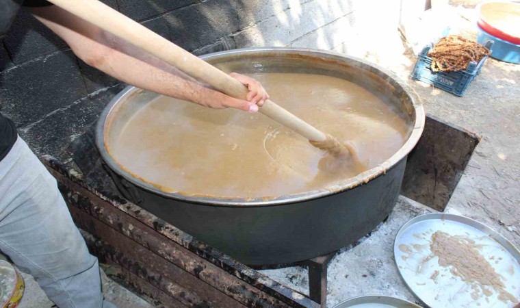 Üzüm suyu ve un ile yapılan pestile mikroplarından arınması için toprak kattıklarını belirten Seda Gülpınar; ‘’Burada pestil yapıyoruz. Üzümleri sıktıktan pisliğini arındırsın diye toprak koyuyoruz içine temizlenmesi için. Üzüm suyu kaynadıktan sonra, demir taslarla alıyoruz. Kovalara dolduruyoruz, zaten toprak altta kalıyor ve temizleniyor’’ ifadelerini kullandı.