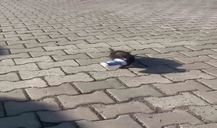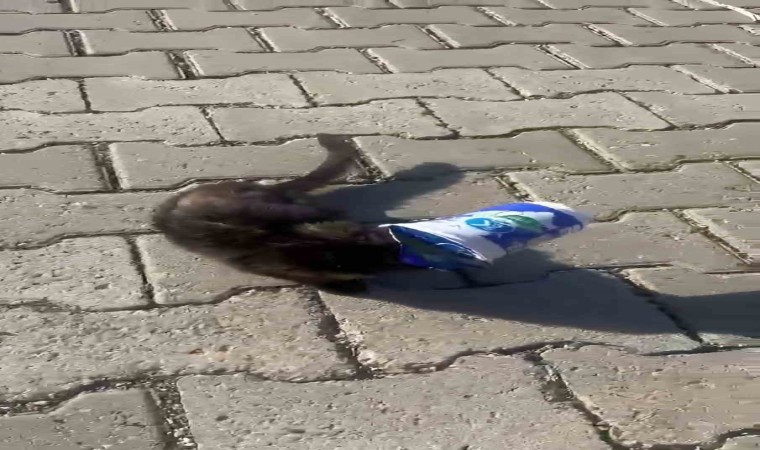 Siirt’te kafasını ayran kutusuna sıkıştıran yavru kedi, yoldan geçen vatandaş tarafından kurtarıldı.