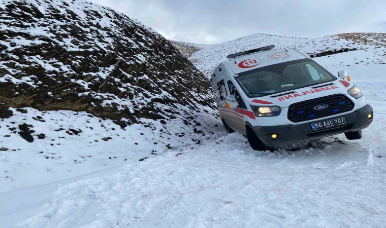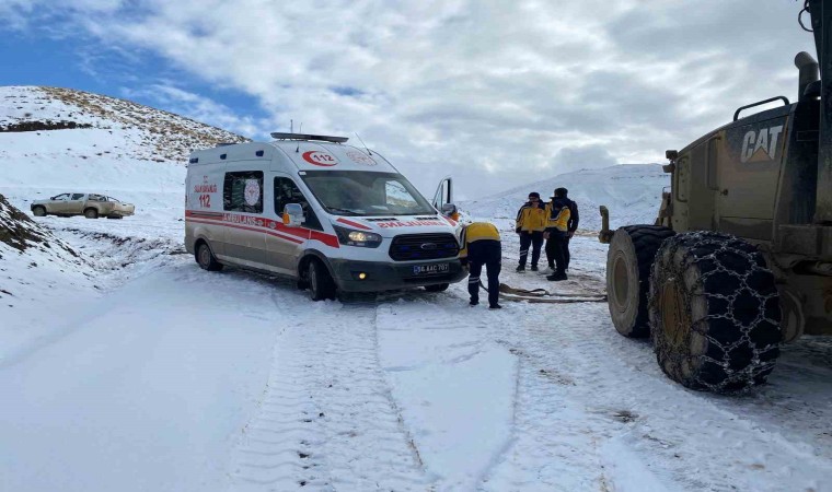 Siirt’in Pervari ilçesinde, yoğun kar yağışı nedeniyle yolda mahsur kalan ambulans, Siirt İl Özel İdaresi ekiplerince kurtarıldı.