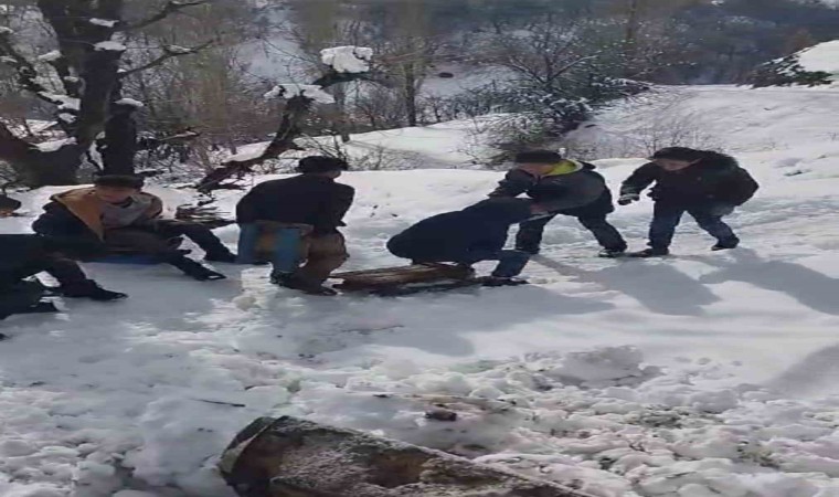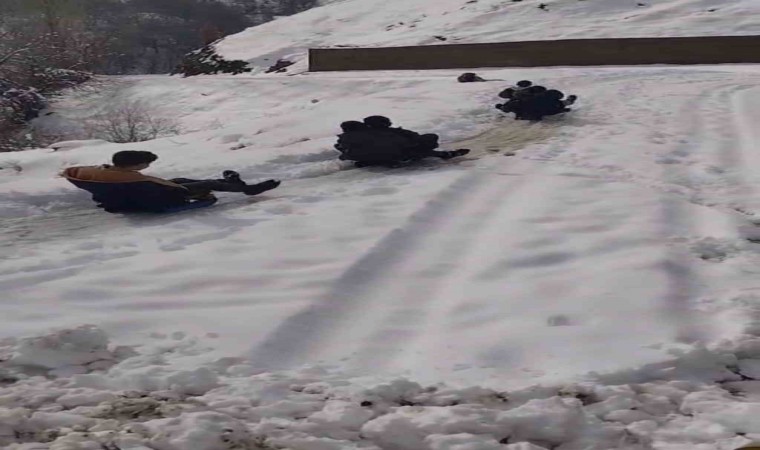 Siirt’in Şirvan ilçesine bağlı Cevizlik köyünde karda kaymanın keyfini çıkaran çocuklar, kepçe operatöründen yolu temizlememesini istedi.