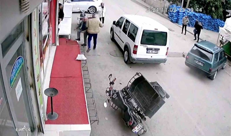 Edinilen bilgilere göre olay, dün akşam saatlerinde ilçe merkezinde 26 AHF 339 plakalı araç, sürücüsünün direksiyon hakimiyetini kaybetmesi sonucu önce park halindeki motosiklete, ardından yol kenarında bulunan marketin manav reyonuna çarparak durabildi. Kazada ölen ya da yaralanan olmazken, bir iş yeri önünde oturanların panik anları güvenlik kameralarına yansıdı.