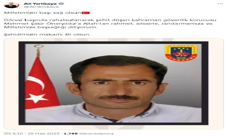 İçişleri Bakanı Ali Yerlikaya, Twitter hesabından güvenlik korucusu Mehmet Şakir Öneryıldız için başsağlığı mesajı yayımladı. Yerlikaya, "Milletimizin başı sağ olsun. Görevi başında rahatsızlanarak şehit düşen kahraman güvenlik korucusu Mehmet Şakir Öneryıldız'a Allah'tan rahmet; ailesine, jandarmamıza ve milletimize başsağlığı diliyorum" ifadelerini kullandı.