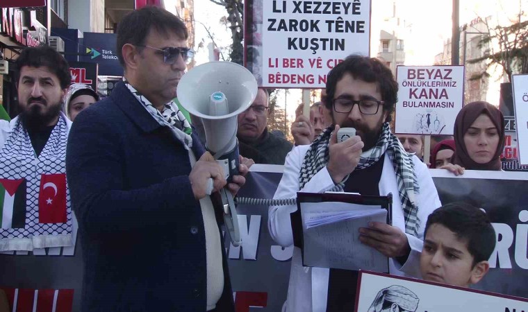 Siirt’te sağlık çalışanları, İsrail’in Gazze’de yaptığı saldırılara tepki göstererek tek yürek oldu.