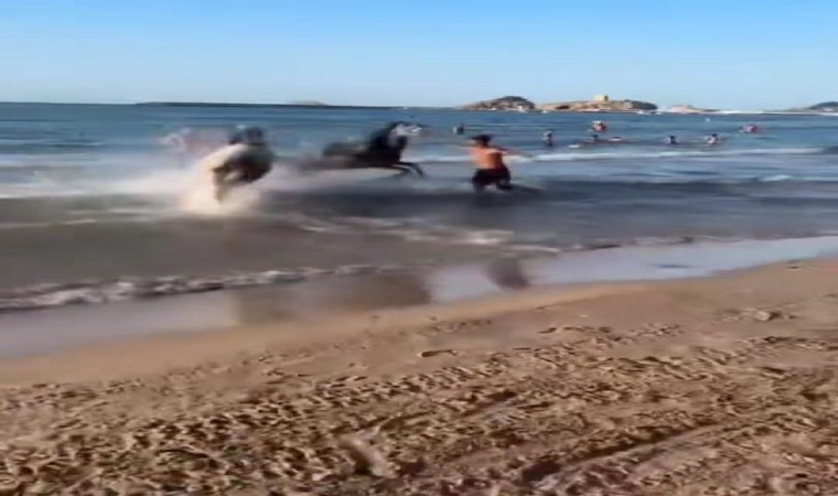Şile’de, bir plaja getirilen iki at, denize girmek için gelen insanların arasına daldı. Atların plajı birbirine kattığı anlar bir vatandaşın cep telefonu kamerasına yansıdı.