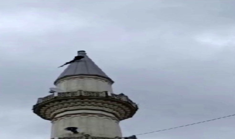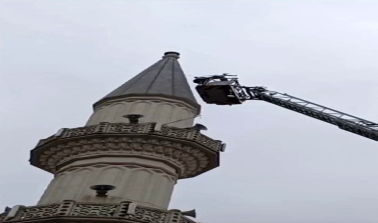 İstanbul’da etkili olan fırtına nedeniyle Şile’de bulunan bir camiinin minaresindeki alem devrildi. Halata bağlı halde askıda kalan alemi bulunduğu yerden itfaiye ekipleri sökerek düşmesini engelledi.