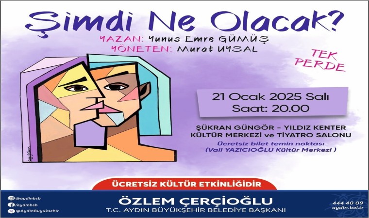 Yunus Emre Gümüş tarafından kaleme alınan ve Murat Uysal tarafından yönetilen ’Şimdi Ne Olacak?’ tiyatro oyununa tüm Aydınlıları davet eden Aydın Büyükşehir Belediye Başkanı Özlem Çerçioğlu, sevilen tiyatro oyunlarını vatandaşlarla buluşturmaya devam edeceklerini belirtti.
