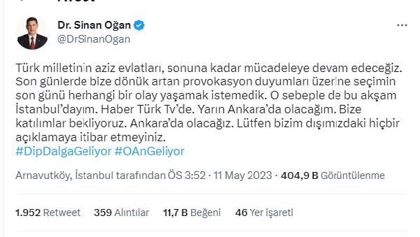 (DHA) - ATA İttifakı Cumhurbaşkanı Adayı Sinan Oğan, yarınki Antalya programını iptal etti. Twitter hesabından açıklama yapan Oğan, "Bize katılımlar bekliyoruz. Ankara'da olacağız. Lütfen bizim dışımızdaki hiçbir açıklamaya itibar etmeyiniz" dedi.