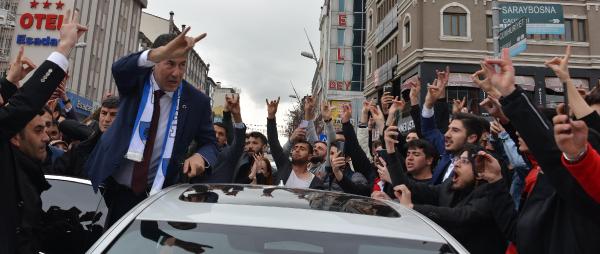 Bir süre daha kent merkezinde gençlerin 'Bozkurt Sinan' sloganları eşliğinde iş yerlerini dolaşıp esnafla görüşen Sinan Oğan, kara yoluyla Kars'a hareket etti. (DHA)