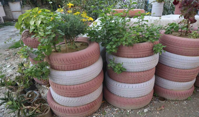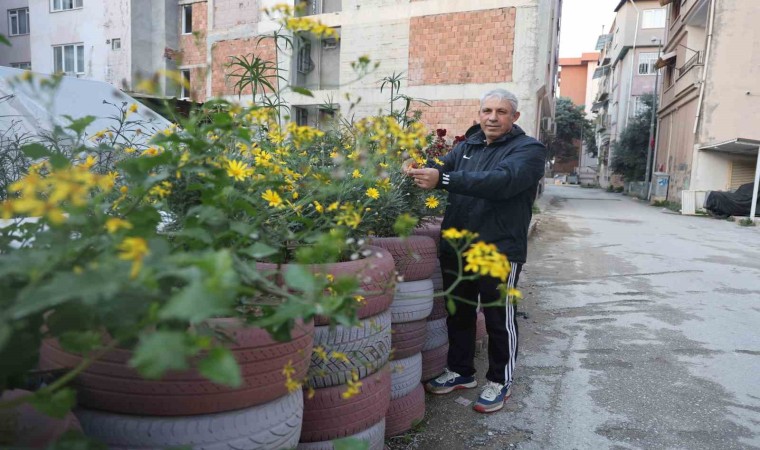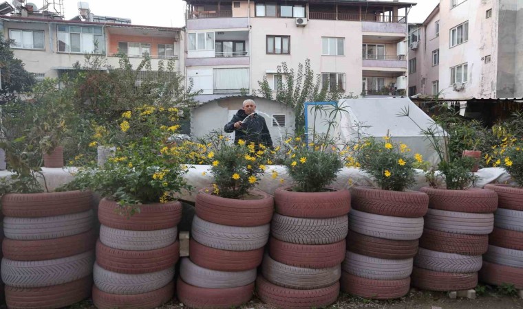 Hatay’ın Defne ilçesinde yaşayan ve sokaklardan topladığı atık lastikleri çiçek dikerek değerlendiren Hüseyin Şaker, moloz yığınlarıyla kaplı arsayı yaklaşık 200 lastikle çiçek bahçesine dönüştürdü.