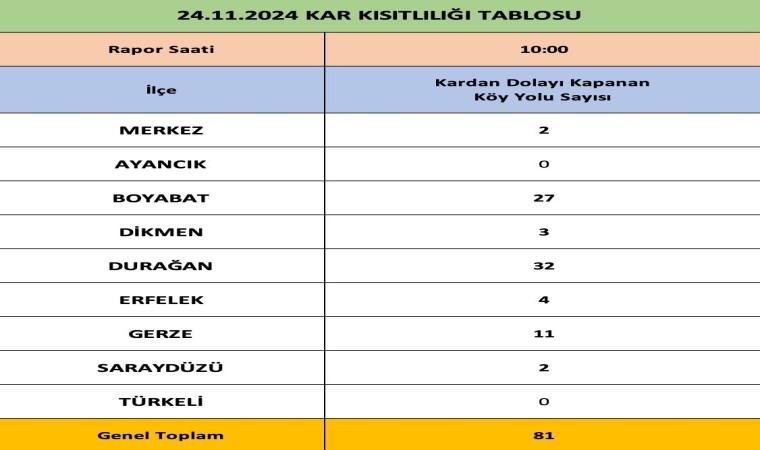 Sinop Valiliği’nden yapılan açıklamada, merkezde 2, Boyabat’ta 27, Dikmen’de 3, Durağan’da 32, Gerze’de 11, Saraydüzü’nde 2 ve Erfelek’te 4 olmak üzere toplam 81 köy yolunun kapandığı bildirildi.