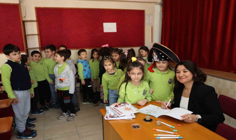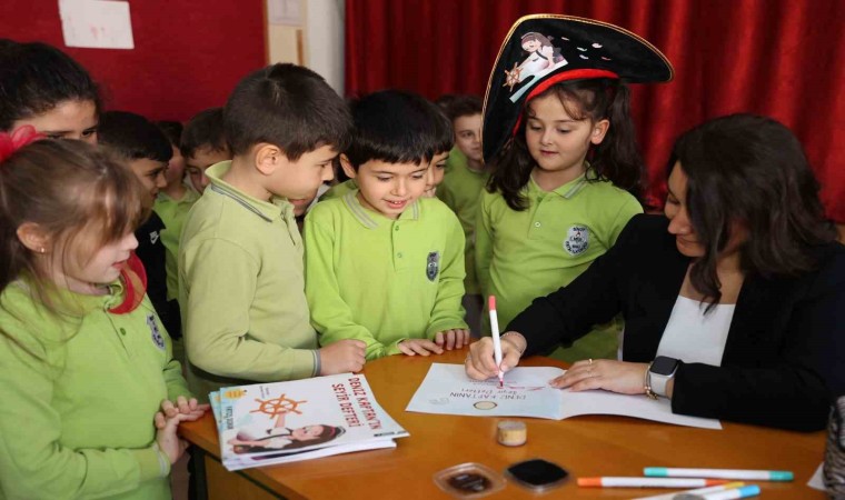 Fatoş Doruk etkinlik sonunda okul yönetimi tarafından okul içerisinde oluşturulan kitap kumbarasına kaleme aldığı “Deniz Kaptan’ın Seyir Defteri” isimli kitabını imzalayarak hediye etti.