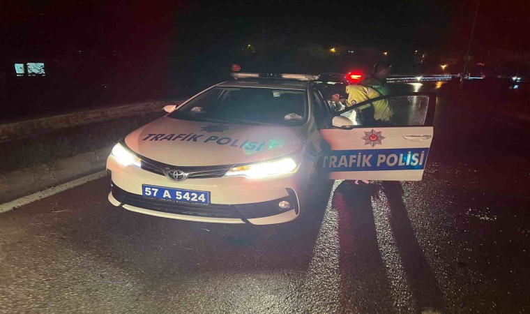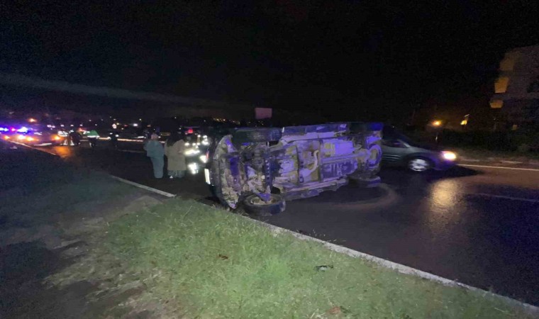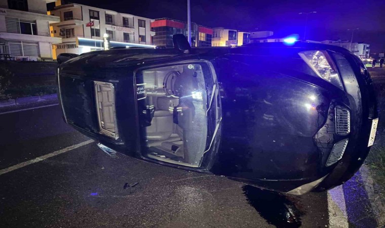 Sinop’ta direksiyon hakimiyetini kaybeden araç, refüje çarparak yan yattı.