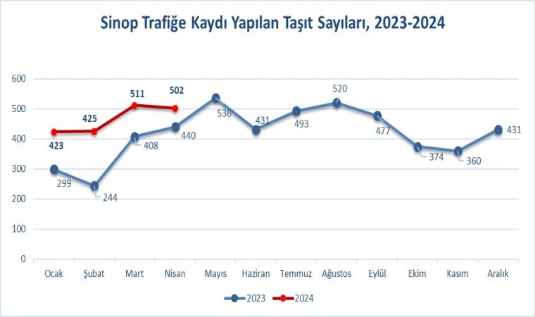 Sinop’ta Nisan ayında 502 adet taşıtın trafiğe kaydı yapıldı. Trafiğe kaydı yapılan toplam 502 adet taşıt içinde motosiklet yüzde 73,1 ile ilk sırada yer aldı. Bunu yüzde 18,1 ile otomobil, yüzde 4,4 ile traktör ve yüzde 4,0 ile kamyonet, takip etti. Sinop’ta Nisan ayında trafiğe kaydı yapılan toplam taşıt sayısı bir önceki aya göre 9 adet azaldı. Sinop’ta Nisan ayında 20 farklı otomobil markasından 91 adet aracın trafiğe kaydı yapıldı.