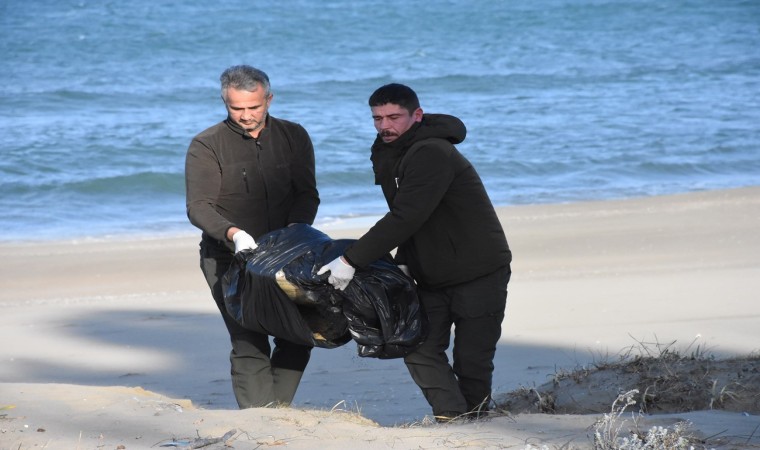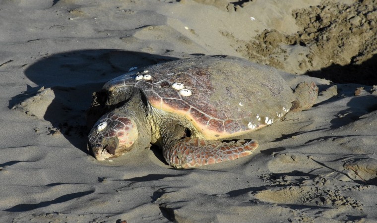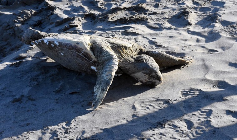Sinop’ta nesli tükenmekte olan caretta caretta cinsi kaplumbağa, sahilde kumun içinde ölü halde bulundu.