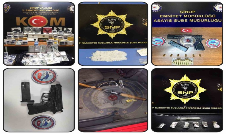 Sinop İl Emniyet Müdürlüğü ekipleri, Haziran ayını kapsayan asayiş raporunu açıkladı. İl genelinde gerçekleştirilen şok uygulamalarda elde edilen sonuçlara göre, 1 ay içinde 33 aranan kişi yakalandı ve 13 kişi tutuklandı. Ayrıca, 14 adet ruhsatsız tabanca, 3 adet av tüfeği ve 258 fişek ele geçirildi. Kaçakçılık operasyonlarında ise 46.5 litre sahte alkol ve 302 gümrük kaçağı elektronik eşya piyasaya sürülmek üzere ele geçirildi. Kent merkezinde yapılan uyuşturucu operasyonlarında da 35 kök Hint keneviri, 12,38 gram esrar, 5,7 gram bonzai ve 1,76 gram kokain ele geçirildi.