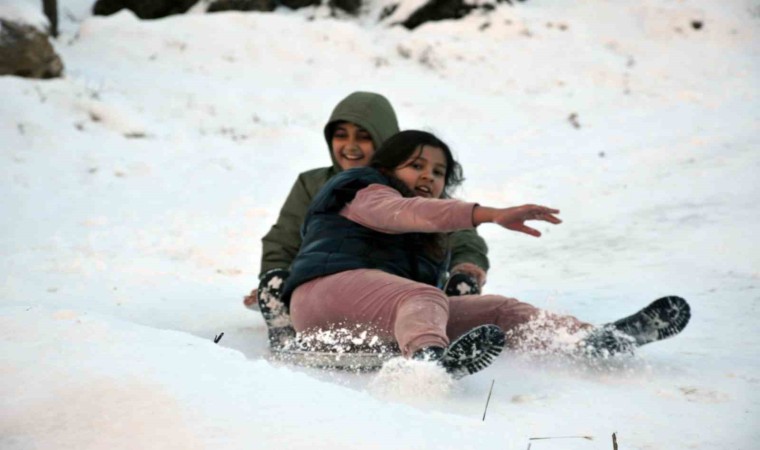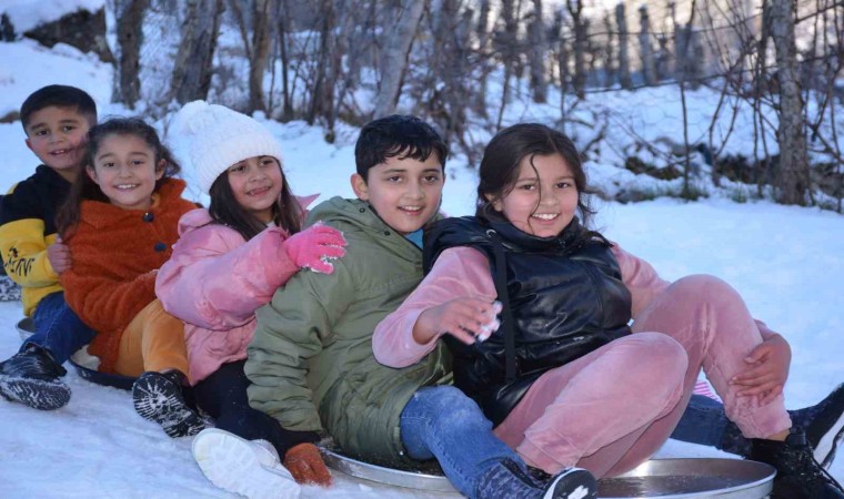 Şırnak’ın Beytüşşebap ilçesinde çocuklar, kar yağışı sonrası buz pistine dönüşen yerlerde leğen ve tepsi ile kaymanın keyfini çıkardı.