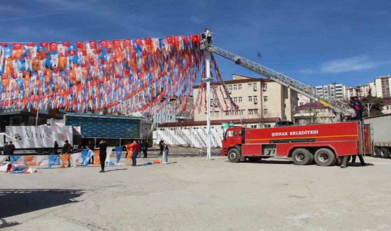 31 Mart Yerel Seçimleri öncesi Şırnak Adiye Meydanı’nda yarın Cumhurbaşkanı Erdoğan’ın kenti ziyareti nedeniyle devam eden çalışmalar tamamlandı. Kentin farklı noktalarına pankart, bayrak, billboardlara ilanlar ve afiş asılırken, belediye ekipleri çevre düzenlemeleri ve yol temizleme çalışmalarını tamamladı.