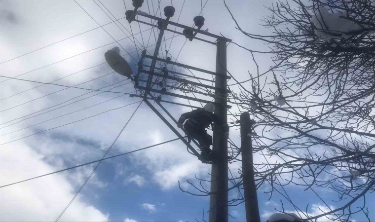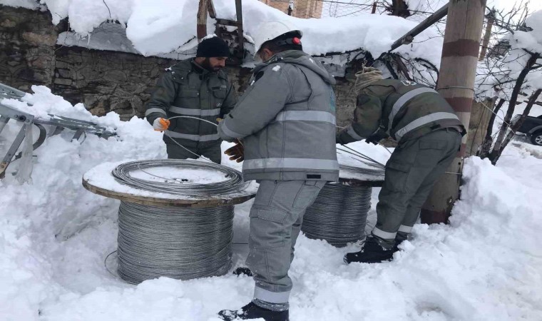 Havanın eksi 27 dereceye kadar düştüğü bölgede giydikleri hediklerle (kar ayakkabısı) yola 2 kilometre uzaklıktaki direğe ulaşmaya çalışan görevliler, zor şartlarda elektrik hatlarını onararak bölgelere enerji veriyor.
