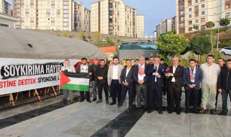 Cumhuriyet Meydanı’nda kurulan ve Filistin’de yaşananların fotoğraflarının yer aldığı çadırda, STK üyeleri nöbet tuttu. Platform adına basın açıklamasını okuyan Abdullah Çatı, “28 gündür tarihinin en büyük yıkım ve soykırımlarından birine şahit oluyoruz. Gazze’de gözlerimizin önünde katliamlar yapılıyor. Bebeklerin, çocukların parçalanmış bedenleri yüreğimizi yakıyor. Bütün dünya 28 gündür Siyonist İsrail’in hukuk tanımaz ve had bilmez zulmüne karşı sessiz kalıyor" dedi.