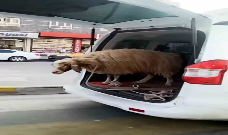Silopi’de sürücüsü ve plakası belirlenemeyen hafif ticari aracın bagajına koyulan bir koyun, aracın bagaj kapısı açık bırakılarak taşındı. O anlar, başka bir araçtan cep telefonuyla çekildi.