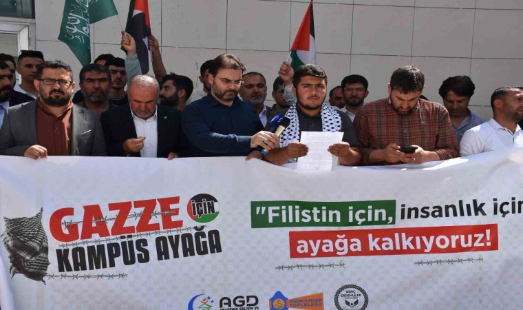 Öğrenciler adına açıklama yapan Yusuf Kızılkaya, İsrail’in aylardır okul, hastane ve sivil yerleşim yeri ayırımı yapmaksızın saldırılarını sürdürdüğünü dün akşamda güvenli bölge olarak nitelendirilen Refah bölgesinde masum sivilleri yakarak şehit edildiğini söyledi.