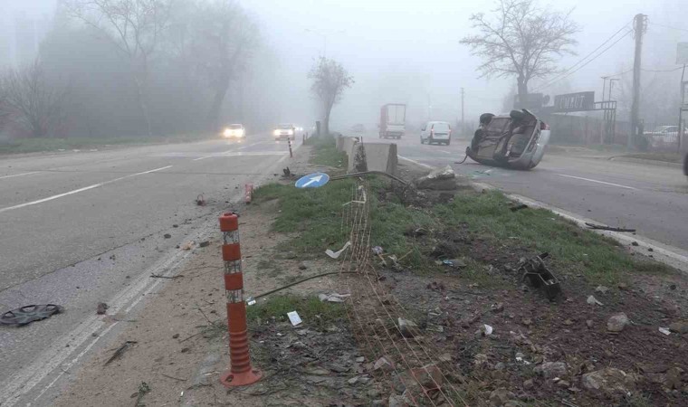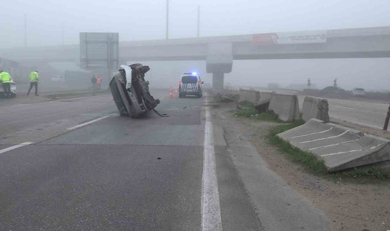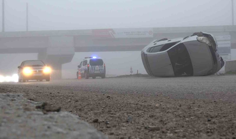 Bursa’da yoğun sis sebebiyle görüş mesafesi kaybolan sürücü, refüjdeki beton bariyere çarptıktan sonra takla attı. Sürücü, yaralı olarak hastaneye kaldırıldı.
