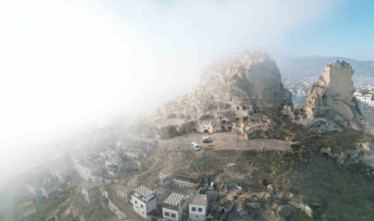 Doğal, tarihi ve kültürel zenginlikleriyle yerli ve yabancı turistlere her mevsim farklı manzara sunan Kapadokya’da bugün de sis etkili oldu. Kapadokya bölgesinin önemli destinasyonları arasında yer alan ve dünyanın en büyük doğal gökdeleni niteliğindeki Uçhisar Kalesi ve çevresinde etkili olan sis, bölgeyi gelen yerli ve yabancı turistler için de farklı bir görsel şölen sundu.