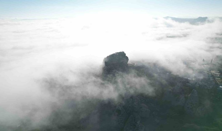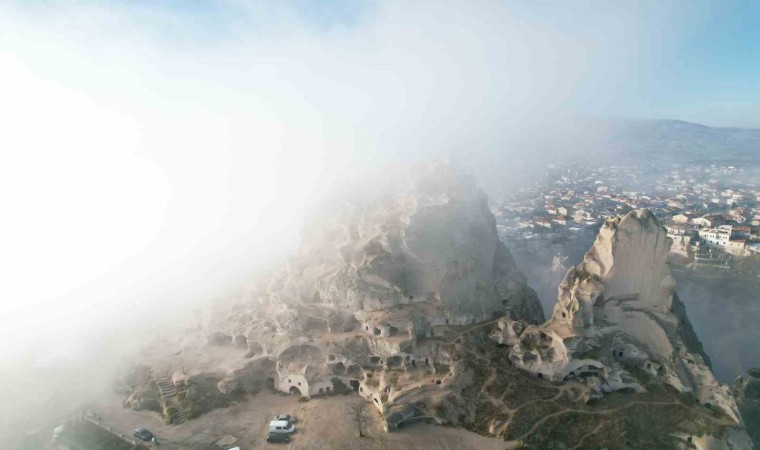 Dünyanın ve Türkiye’nin önemli turizm merkezlerinden olan Kapadokya bölgesinde oluşan sis turistler için farklı bir görsel şölen oluşturdu. Sisler içinde kaybolan Uçhisar Kalesi ve peribacaları dron ile havadan görüntülendi.
