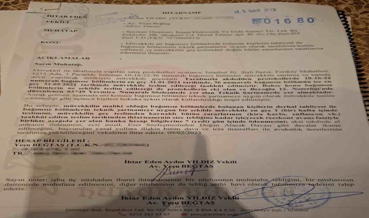 İddiaya göre, Gayrimenkul Uzmanı Aydın Yıldız Şişli Feriköy Mahallesi’nde 3 sene önce yeni yapılmaya başlanan bir binadan 4 daire satın aldı. Dairelerin teslim edilmesi konusunda iddiaya göre, pandemi döneminde yaşanan fiyat farkı bahane edilerek sıkıntı yaşandı. Tapulu dairelerini bir türlü teslim alamayan Yıldız, müteahhide konuyla ilgili davacı olacağını söyledi. Bunun ardından tehdit telefonları kesilmedi. Babasının mezarına giden Yıldız, iddiaya göre kimliği belirsiz kişiler tarafından takip edildi. Yanına gelen kişiler, Yıldız’a alacaklarını olduğunu söyleyerek dairelerinden birini istedi. Bu isteği geri çeviren Yıldız, kendisini tehdit ettirdiğini öne sürdüğü müteahhitten davacı oldu. Bu süre içinde Yıldız’ın daireleri kendisi yurtdışındayken ondan habersiz bir şekilde kısa süreliğine kiraya verildi. Bir süre sonra boşaltılan daireler daha sonra yeni kişilere kiralandı. Şahısların kaçak elektrik kullandığını ve sahte belgelerle daireye su bağladıkları iddia eden Yıldız, dava sürecinin devam ettiğini belirterek sorumluların yakalanmasını istedi.