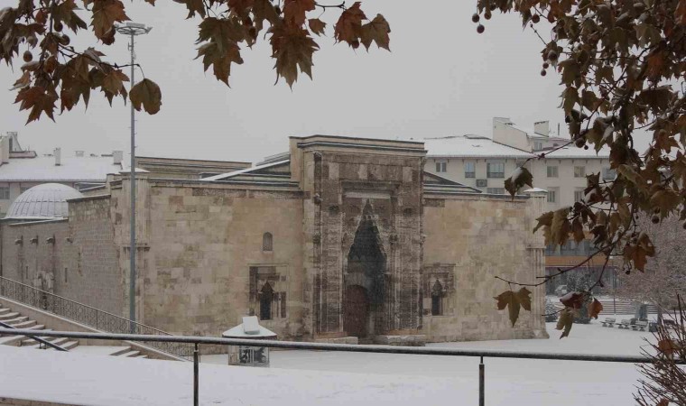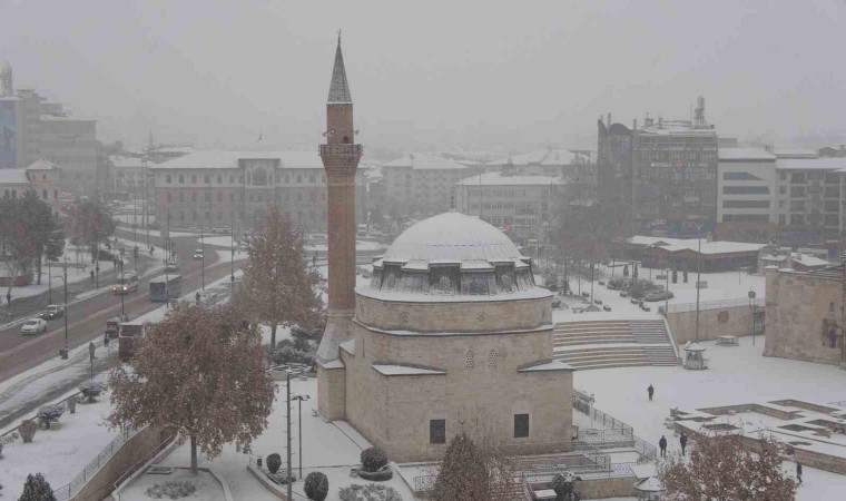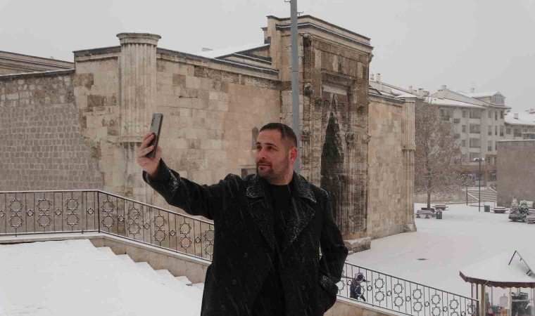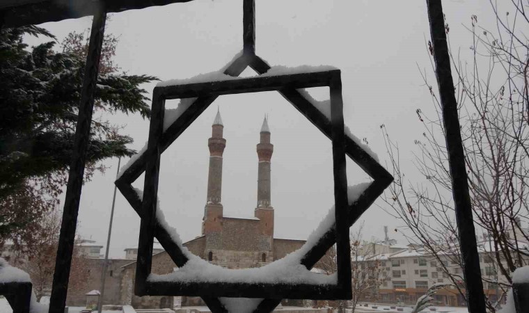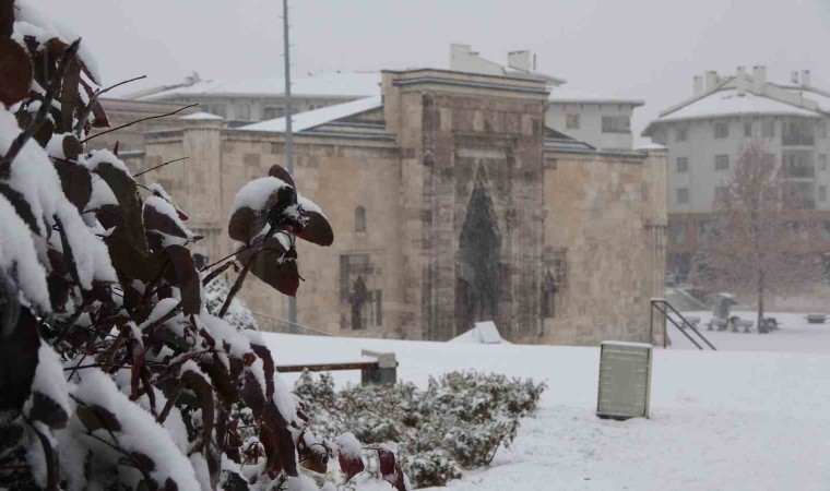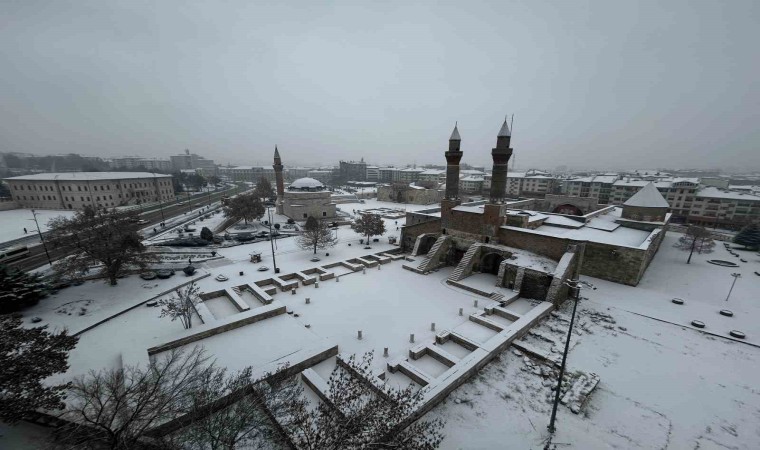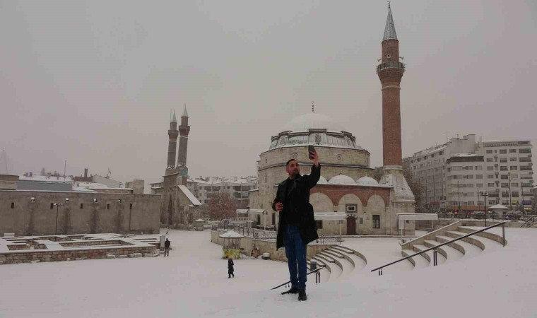 Sivas’ta sabah saatlerinde etkili olan kar yağışı tarihi kent meydanında kartpostallık görüntüler oluşturdu.