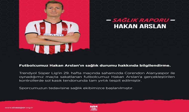 Sivasspor, orta saha oyuncusu Hakan Arslan’ın sol kasık tendonunda tam yırtık tespit edildiğini açıkladı. Arslan, bir süre yeşil sahalardan uzak kalacak.