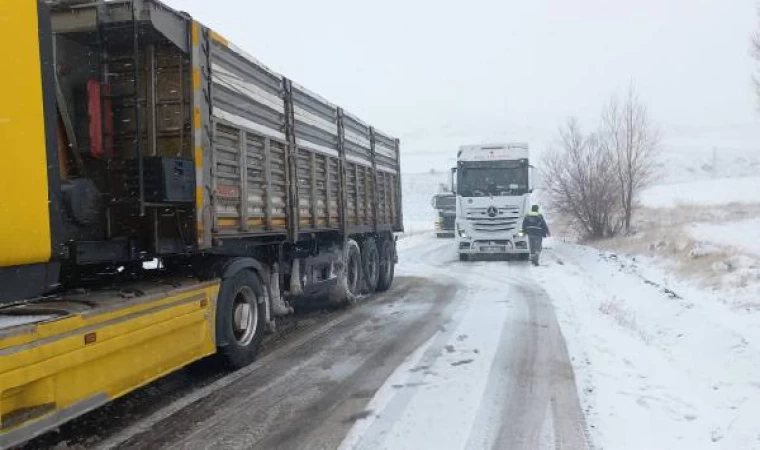 Uğur YİĞİT/SİVAS, (DHA)- SİVAS'ın Divriği ilçesinde etkili olan kar yağışı nedeniyle zincirsiz olan ağır tonajlı araçlar yolda kaldı.