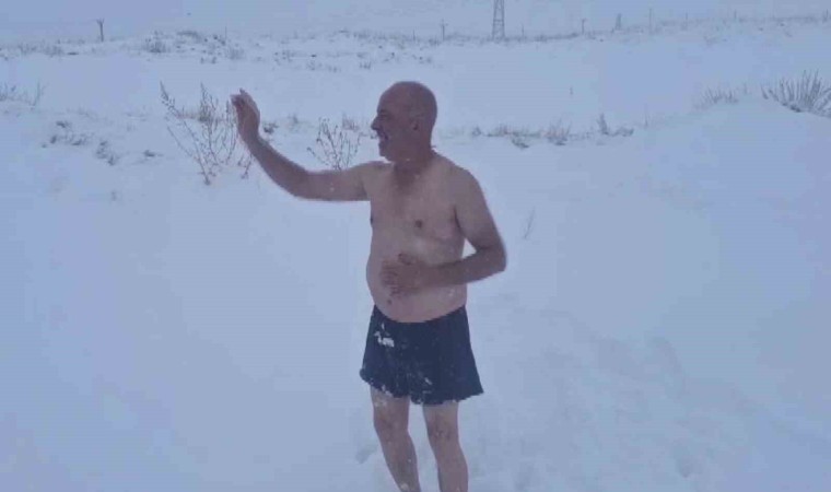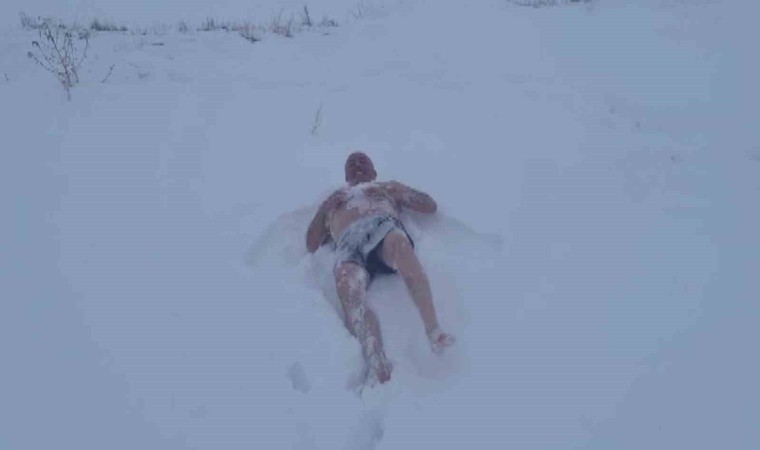 Sivas’ın Şarkışla ilçesinde yaşayan 60 yaşındaki adam, dondurucu soğuğa rağmen soyunarak kar banyosu yaptı. O anlar cep telefonu kamerasına yansıdı.