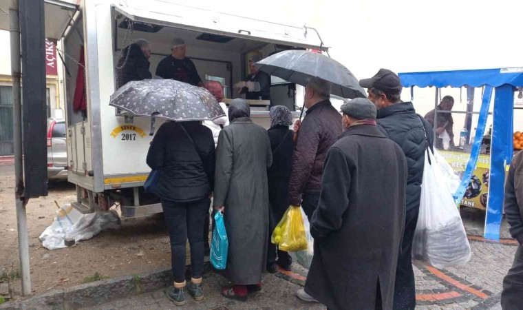 Edirne’de soğuk ve yağışlı havada hayır lokması için sıraya giren vatandaşlar, zaman zaman uzun kuyruklar oluşturdu.