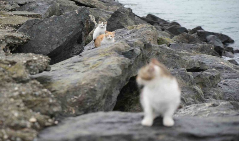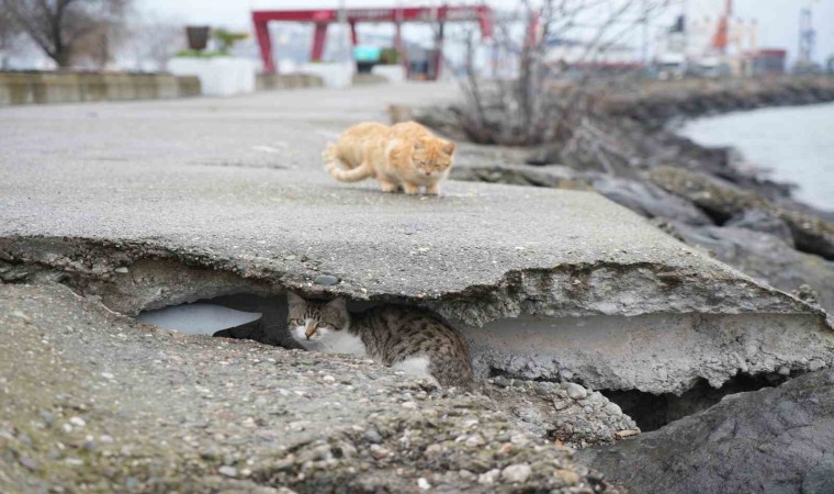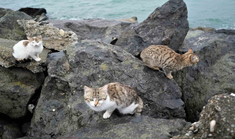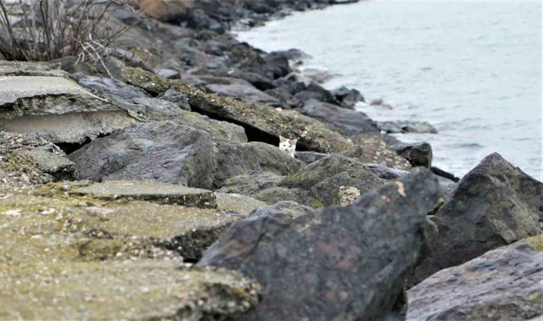 Soğuk havanın etkili olduğu Samsun’da üşüyen kediler sahil kenarında bulunan kayalıkların altına girerek ısınmaya çalışıyor.