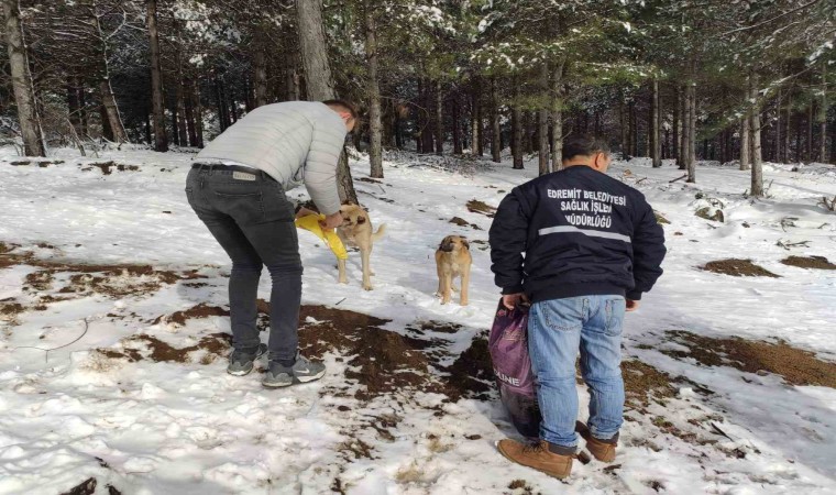 Edremit Belediyesi tarafından Kazdağları’nda çeşitli bölgelerde yaşayan sokak hayvanlarının kar yağışı sonrasında yiyecek bulmakta zorlanmamaları için bölgeye yem bırakıldı.