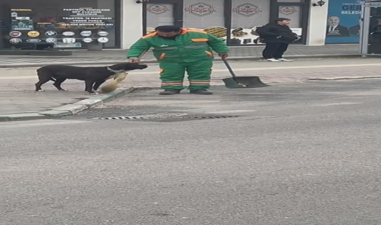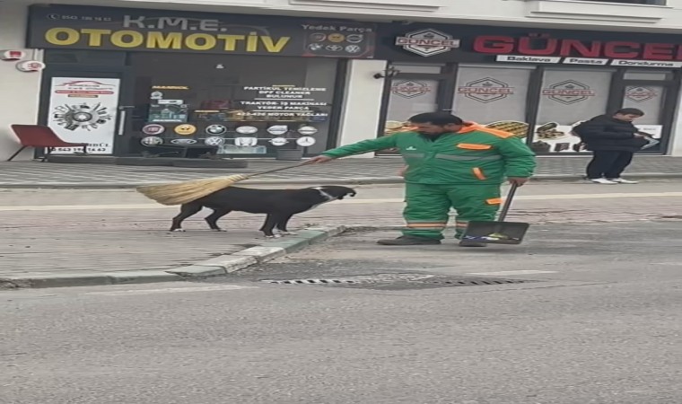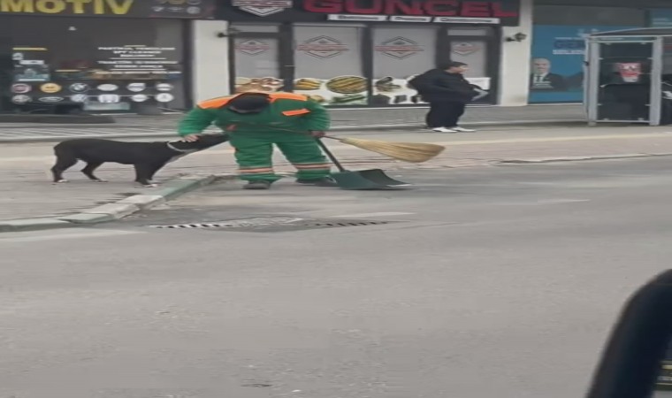Merkez Osmangazi ilçesi Hamitler Mahallesi’nde görevini yerine getiren Osmangazi Belediyesi Temizlik İşleri Müdürlüğü’ne bağlı personelin yanına bir sokak köpeği geldi. Sokak köpeği ile bir süre dolaşan ve arkadaş olan temizlik görevlisi, elindeki süpürge ile köpeğin sırtını hem kaşıdı hem temizledi. Temizlik görevlisi sokak köpeğini bir süre de sevdi. Yüzleri güldüren anlar, saniye saniye cep telefonu kamerasına yansıdı.