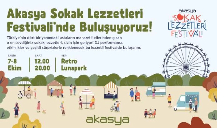 "Akasya, 7-8 Ekim tarihlerinde Akasya Retro Lunapark'ta benzersiz bir Sokak Lezzetleri Festivali'ni deneyimlemeye bekliyor. En sevilen sokak lezzetlerini bir araya getiren ve lezzet tutkunlarını buluşturan Akasya, Sokak Lezzetleri Festivali ile dördüncü kez kapılarını ziyaretçilerine açıyor. Akasya, 'Sokak Lezzetleri Festivali' ile Türkiye'nin çeşitli yörelerine ait lezzetleri, damak tadına düşkün misafirleri ile buluşturacak. İki gün sürecek festivalde misafirler sokak lezzetlerini keşfetme fırsatını bulurken, eğlenceli aktiviteler ve müzik performansları ile de keyifli vakit geçirecek."