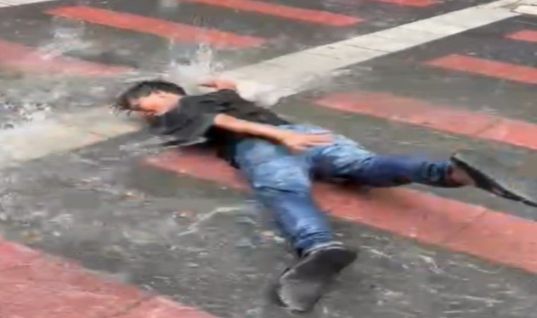 Bolu’nun yüksek kesimlerinde ve kent merkezinde sabah saatlerindeki yaşanan sıcak hava, öğleden sonra yerini sağanağa bıraktı. Şehir merkezinde ve ara sokaklarda su birikintileri oluştu. Bir çocuk, sokakta biriken suya yatıp yüzmeye çalışarak eğlendi. Yağışa aldırmadan biriken suda eğlenen çocuğun o anları ise bir vatandaş tarafından görüntülendi.