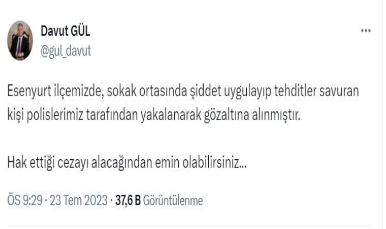 Piri Reis Mahallesi’nde iddiaya göre kadınla tartışan maganda, kadını döverek bayıltmıştı. Kanlar içinde sokak ortasında yatan kadını gören vatandaşlar olaya müdahale etmek istemişti. Vatandaşların seslenmesine kızan şüpheli şahıs küfür etmeye başlamıştı. Şahıs, baygın kadını sürükleyerek arabaya bindirmişti. Polis olayla ilgili çalışma başlatmıştı. Konuya ilişkin sosyal medya adresinden açıklama yapan İstanbul Valisi Davut Gül, şahsın yakalandığını duyurdu. Gül açıklamasında, “Esenyurt ilçemizde, sokak ortasında şiddet uygulayıp tehditler savuran kişi polislerimiz tarafından yakalanarak gözaltına alınmıştır. Hak ettiği cezayı alacağından emin olabilirsiniz.” ifadelerini kullandı.