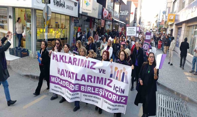 Söke’de kadınlar hep bir ağızdan şiddetin son bulması için ortak bir dille haykırdı. Yapılan açıklamanın ardından Sermin Akkan Arıkan tarafından kadın haklarının dile getirildiği tek kişilik sokak tiyatrosu oyunu sahnelendi. Daha sonra katılımcılar belediye meydanından hareketle İstasyon, Kubilay ve Aydın Caddesi güzergahında yürüyüş gerçekleştirdi. Yürüyüşte düdükler çalınırken, kadın haklarının dile getirildiği sloganlar atıldı.