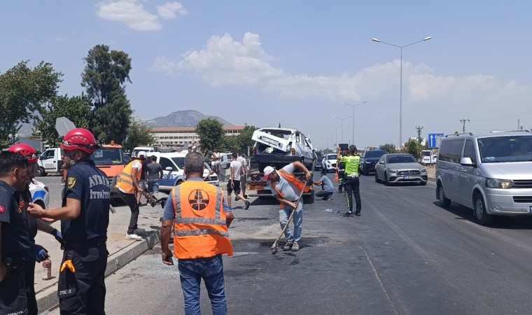 Aydın’ın Söke ilçesinde meydana gelen trafik kazasında bir otomobil yan yatarken, polis ekipleri de otomobile çarptığı iddia edilen tırın yakalanması için çalışma başlattı.